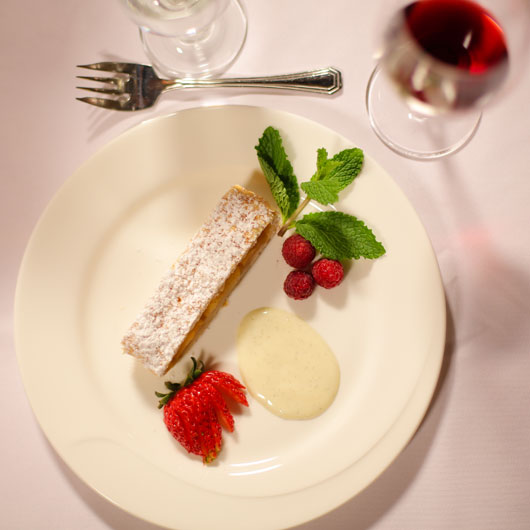 夕食はガイドも一緒にテーブルに付きます。メニューはスープかサラダ、メイン(日によって肉か魚)、パン、温野菜、デザート等です。